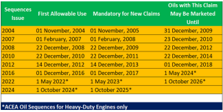Claims made against the ACEA 2023 Heavy-Duty Engine Oil Sequences can be made from 17 October 2023 and are mandatory for all new claims from 17th October 2024. Claims made against the ACEA 2022 Heavy-Duty Engine Oil Sequences are allowable until 1 October 2024.